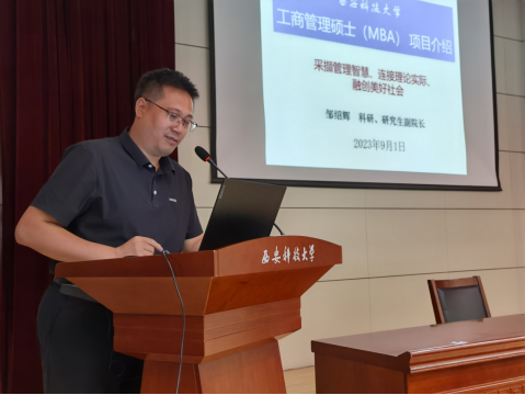 副院长、MBA中心主任邹绍辉教授围绕我们MBA概况、MBA培养环节和流程、课程设置与师资介绍、MBA毕业生发展情况、学习与论文注意事项等五个方面为同学们进行了详细的介绍。他强调MBA学习过程中不仅要学知识,还要学思维,从书本中学、从课堂上学、从同学中学,转变固有思维,跳出行业限制,才能有更全面的认知与决策。同时他希望学员们牢记考研初心,珍惜学习机会,在“本真、笃学、开放、创新”理念的引领下努力提升经济管理的理论知识,扎实钻研,积极与导师交流,通过学院提供的平台,在未来的学习生活中能更好更快的提升和发展。